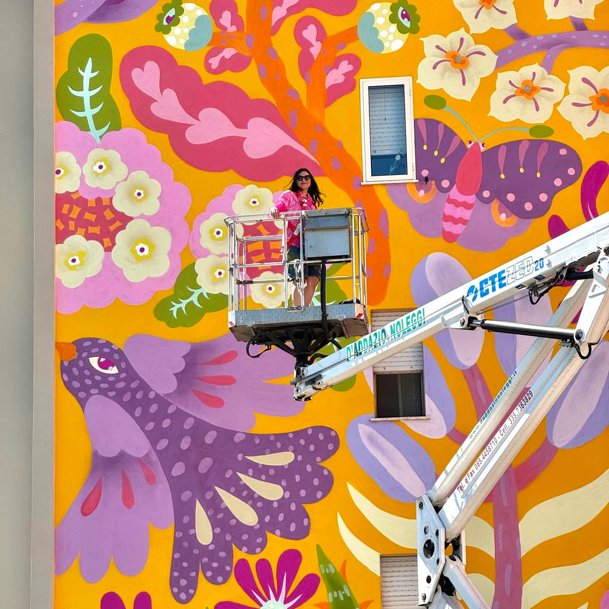 Her murals can be found in Rome, Milan, Turin, Palermo, and Naples, transforming cityscapes into vibrant narratives. One of her most striking works in Rome is a massive street art ‘carpet’ atop Cavour metro station, next to the Colosseum, seamlessly merging contemporary art with history.