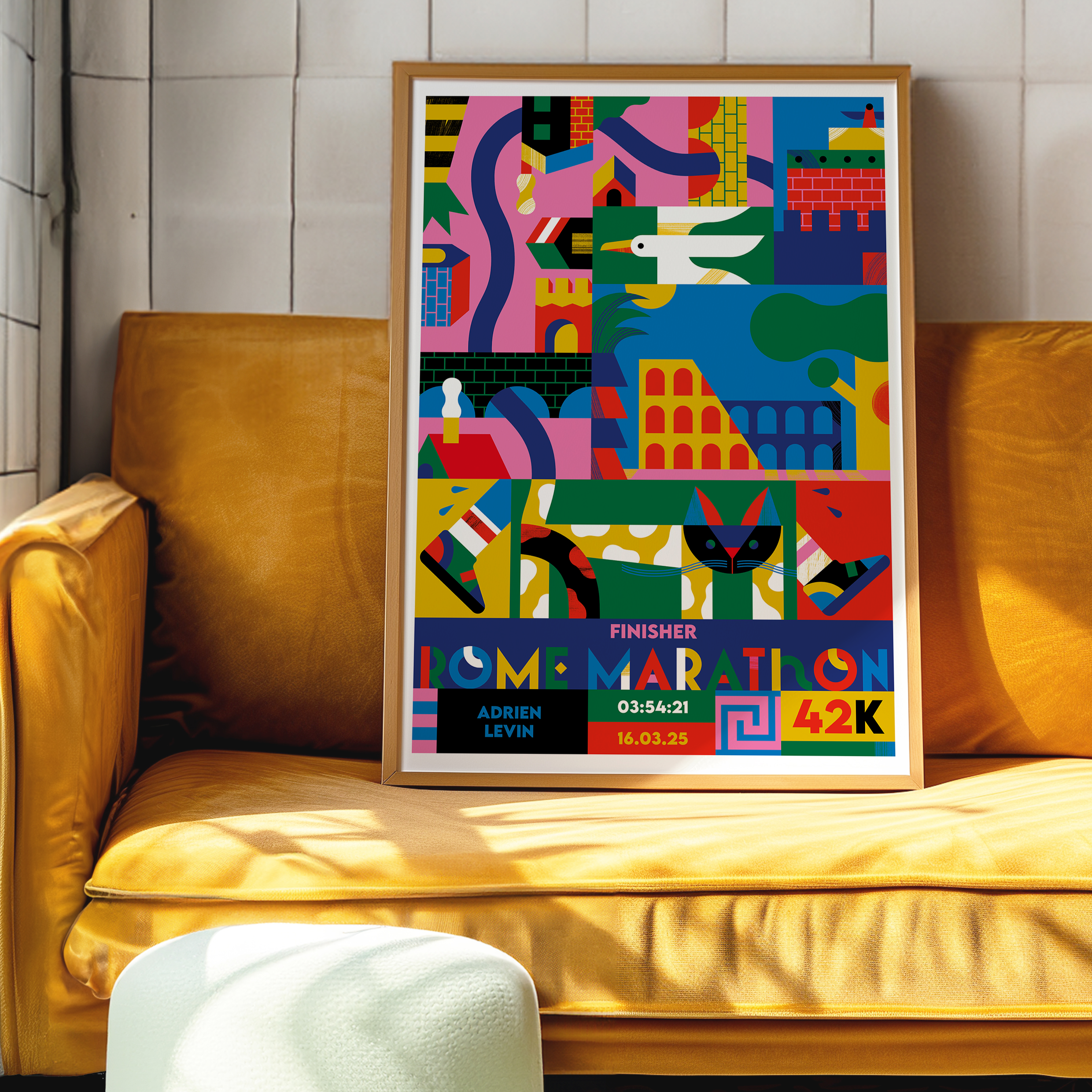 The artwork — where ancient streets meet new personal stories. Inspired by the city's landmarks, urban wildlife, and ever-changing light, the piece reflects the rich history and vibrant movement of runners through the Eternal City.
